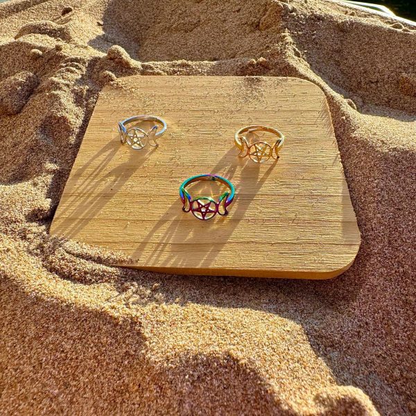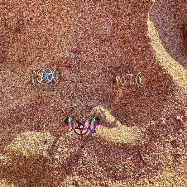 Permite que este anillo resalte tu estilo personal, reflejando tu conexión con el universo y tu aprecio por los símbolos místicos. Deja que el diseño de pentagrama y tres lunas, junto con el acabado en oro, plata o arcoíris, añadan un toque de elegancia y energía positiva a tu look diario.