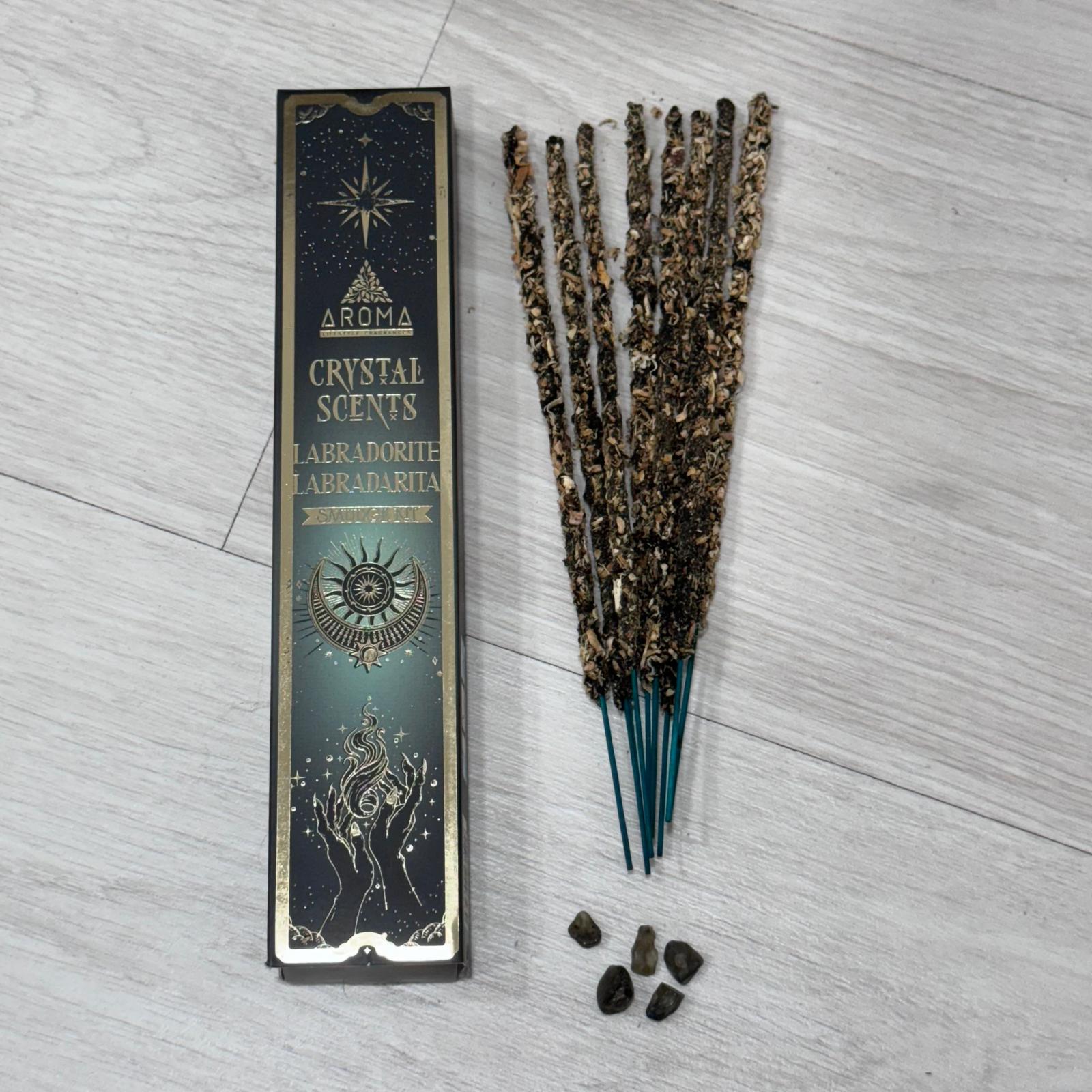 Fabricado con devoción y siguiendo tradiciones ancestrales, cada varilla es una obra de arte que combina esencias aromáticas con las vibraciones cristalinas de la labradorita. Los ingredientes son seleccionados meticulosamente para ofrecerte una experiencia que es tanto sensorial como espiritual.
