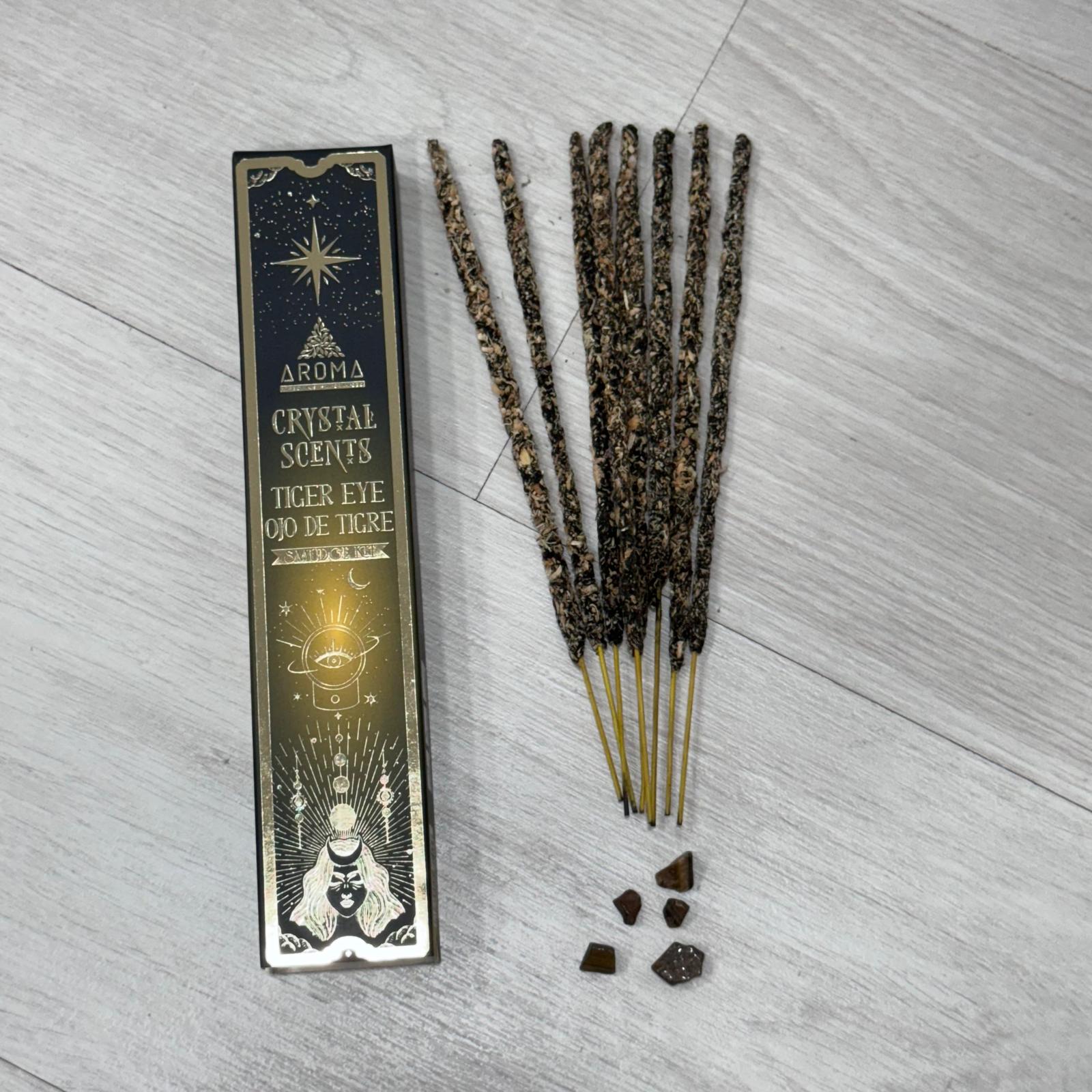 El Incienso Crystal Ojo de Tigre es una poderosa combinación entre la energía protectora del ojo de tigre y fragancias naturales, diseñado para infundir confianza y equilibrio en tu espacio. Cada varilla está cuidadosamente elaborada e infundida con finas virutas de ojo de tigre, una piedra reconocida por sus propiedades energéticas y su capacidad para potenciar la fuerza interior.