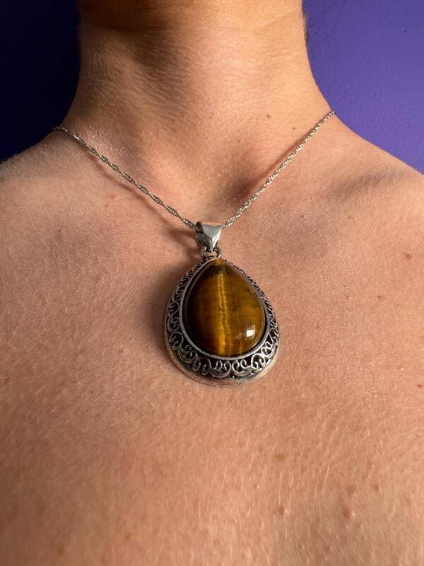 Permite que este colgante resalte tu estilo personal y tu conexión con las energías de la naturaleza. Deja que el diseño sofisticado y las propiedades del Ojo de Tigre añadan un toque de magia y protección a tu look diario.
