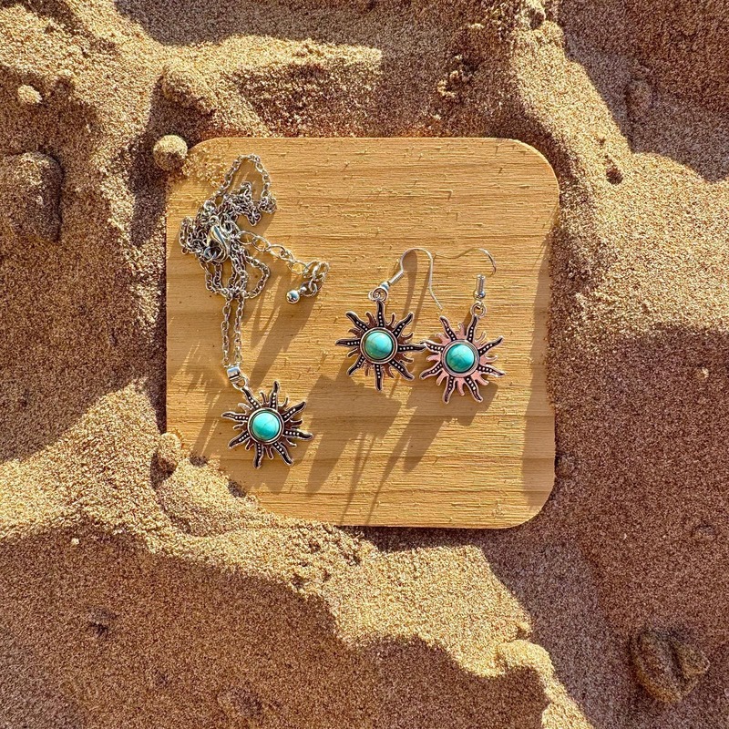 El Conjunto de Collar y Pendientes de Piedra Natural Turquesa en Forma de Sol no es solo un conjunto de joyas; es una expresión de tu estilo y sofisticación, combinando la belleza natural y el diseño étnico en una armonía perfecta.