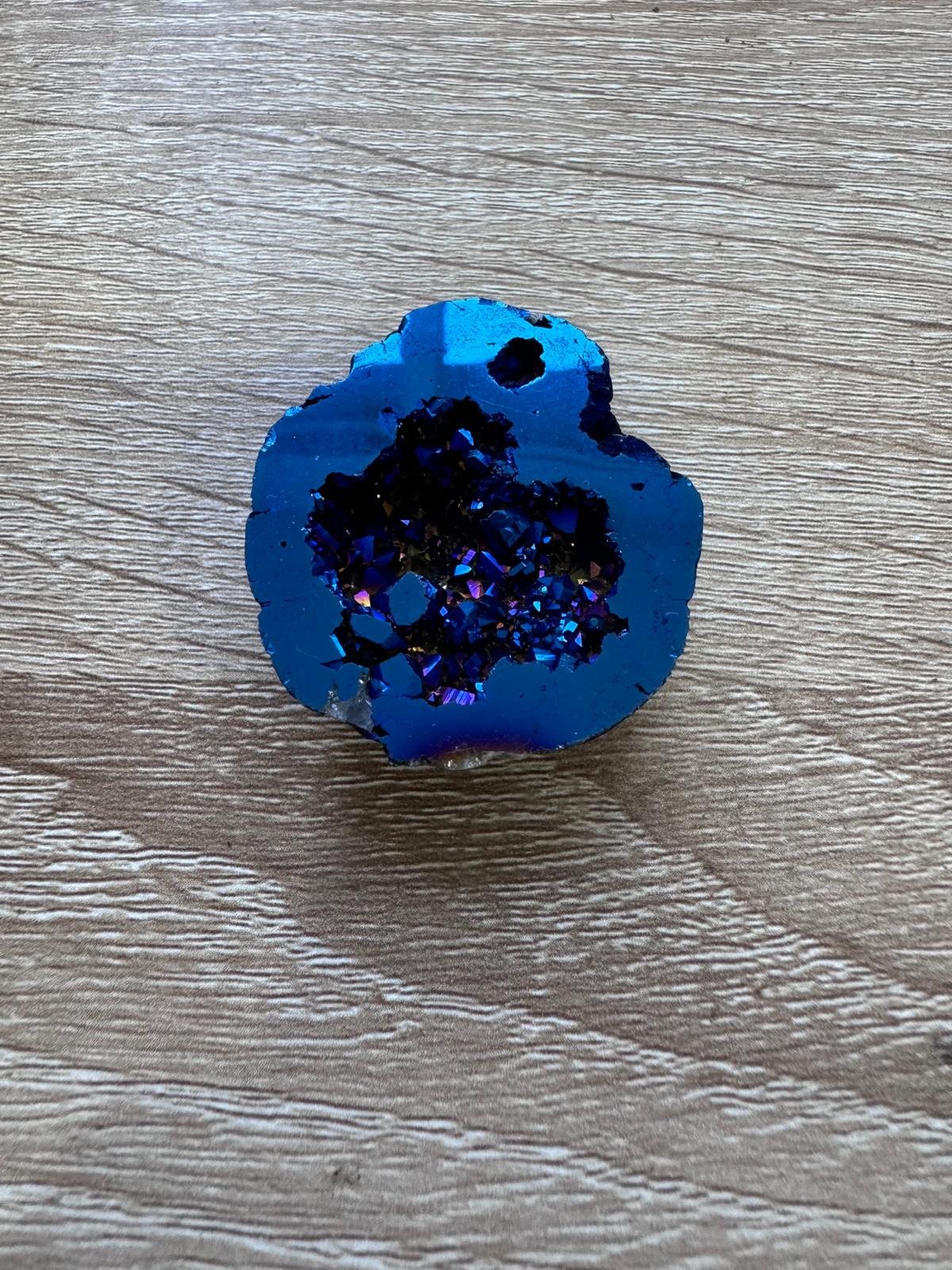 Conéctate con las energías del universo a través de esta hermosa geoda azul, una pieza única que equilibra, limpia y potencia la claridad mental. La vibración calmante de su color azul estimula la paz interior y promueve un entorno sereno, ideal para la meditación y el crecimiento espiritual.