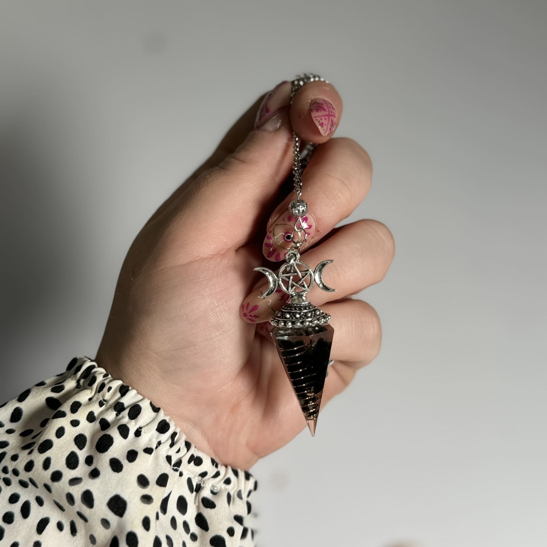 Descubre la precisión y la belleza mística de nuestro Péndulo con Orgonita, Ónix y Tres Lunas Coronando, una herramienta poderosa para la radiestesia y la meditación. Este péndulo no solo es un instrumento funcional para tus prácticas espirituales, sino también una pieza de arte cargada de simbolismo y energía.