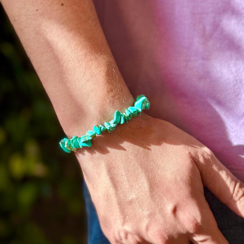 - Armonía y Equilibrio: Con sus tonalidades suaves de azul y verde, los chips de turquesa en esta pulsera promueven la serenidad y el equilibrio emocional, aliviando el estrés y fortaleciendo el bienestar general.