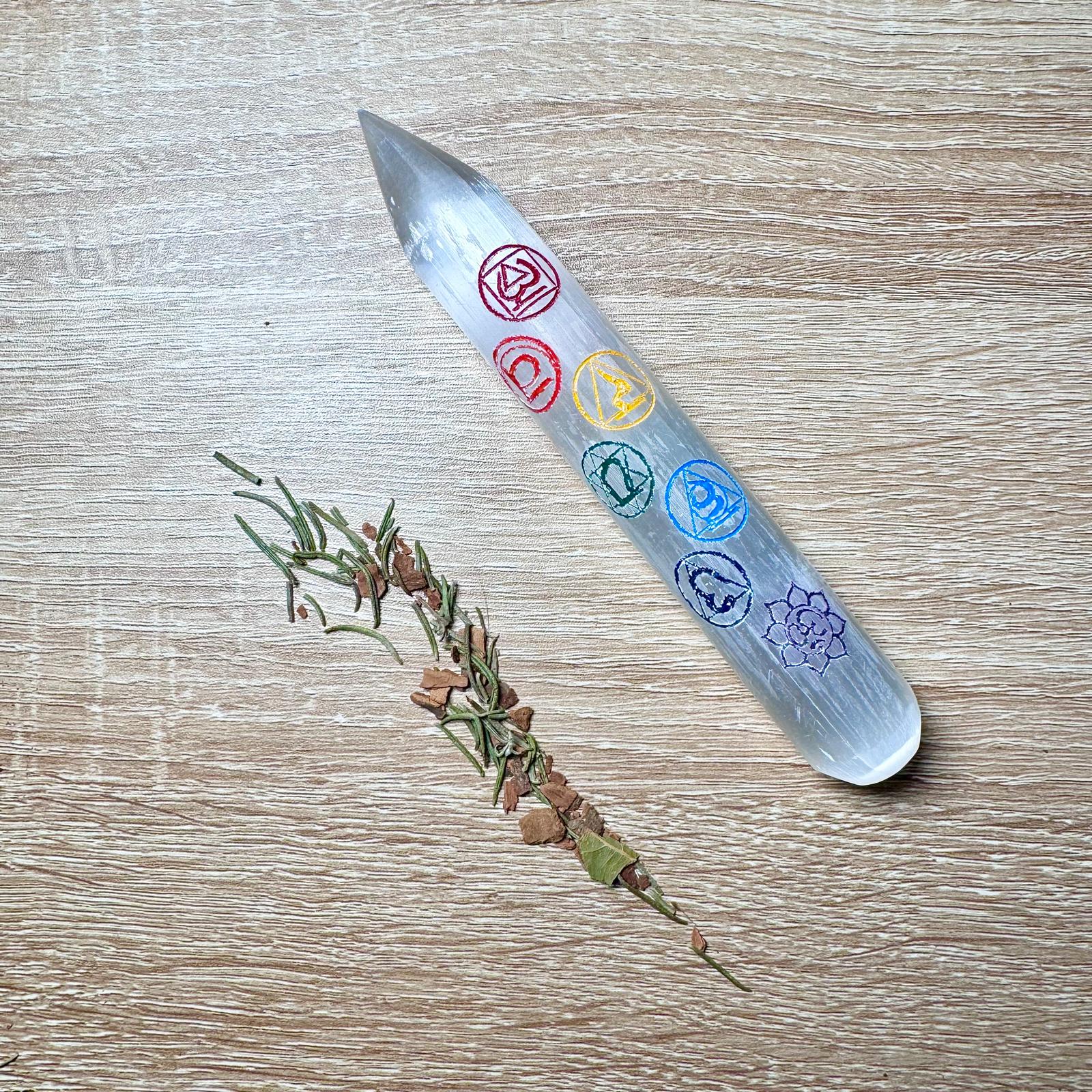 - Material: Selenita natural con símbolos grabados de los 7 chakras, representados en diferentes colores para cada centro energético.