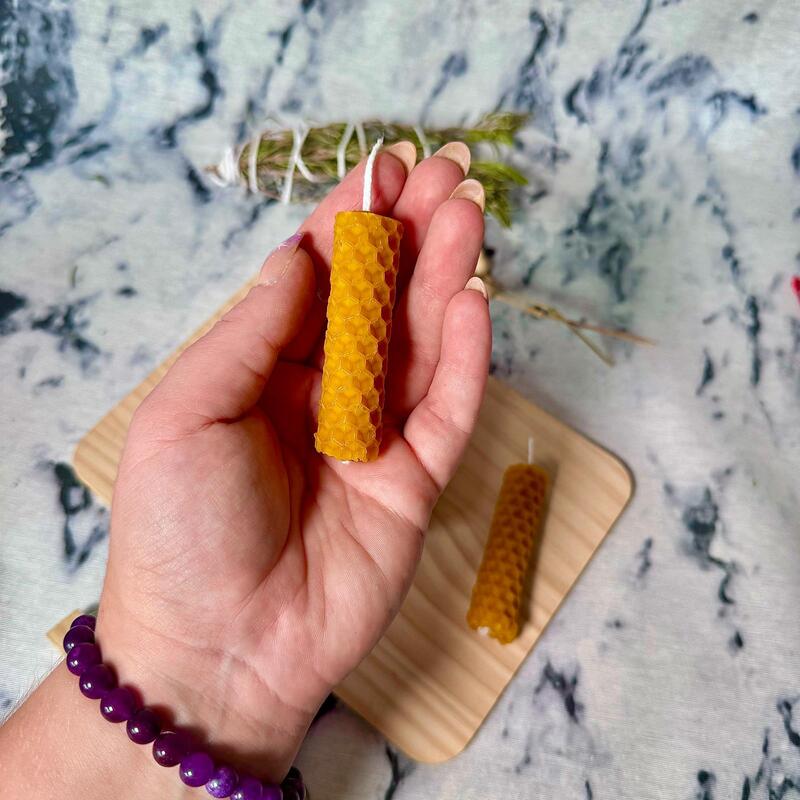 Sumérgete en la dulzura y la magia de la miel con nuestra Vela de Miel Artesanal en formato mini. Con unas medidas de 7 cm de altura y 1,50 cm de diámetro, esta vela es perfecta para rituales pequeños, meditaciones rápidas, o simplemente para añadir un toque de calidez y prosperidad a cualquier espacio.